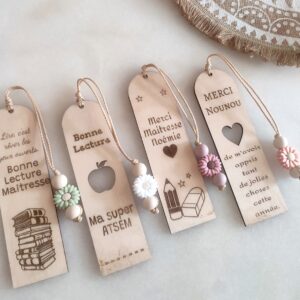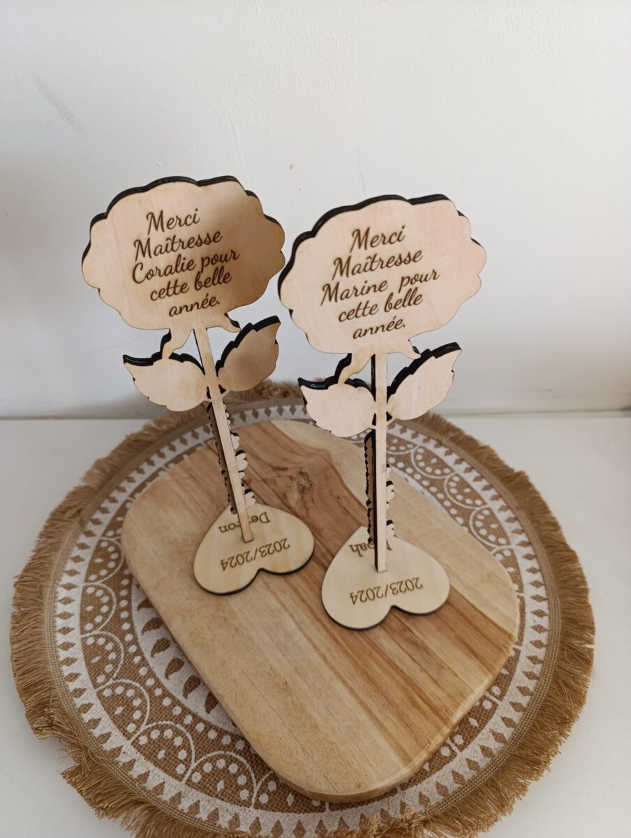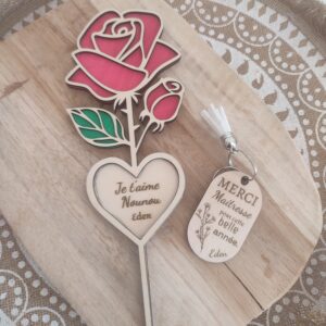 Un a 2 mots comme merci nounou, merci maitresse, super ATSEM, ou un prénom. Possibilité d’inscrire prénom + année scolaire au dos de la rose sur demande